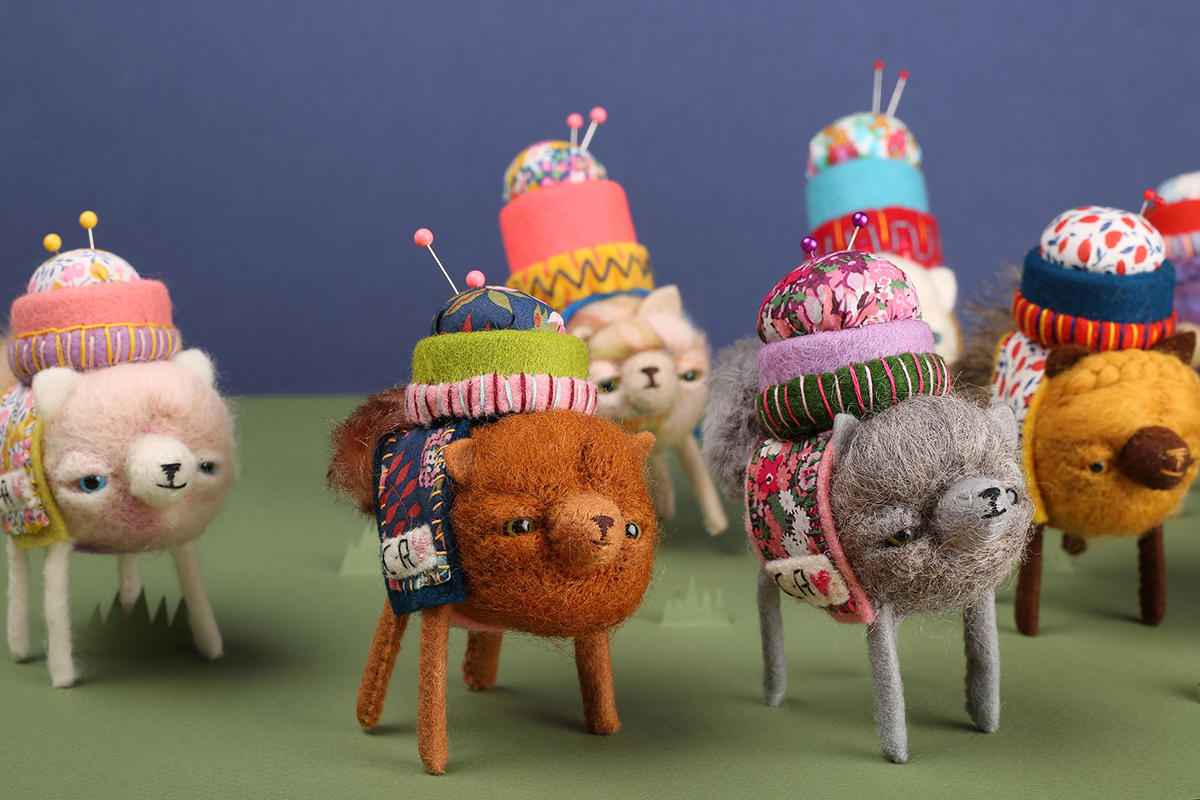 Tekstil sanatçısı Cat Rabbit, Melbourne’daki stüdyosunda kendine özgü kıyafetleri ve aksesuarlarıyla tamamlanmış ilginç bir karakter topluluğu yaratıyor. Kruvasan başlı bir figür çizgili bir etek ve çiçekli bir şapka takıyor, Pomeranyalılar sırtlarında iğne yastıkları taşıyor ve patenlerle donatılmış dört havalı kaniş pistte yarışmaya hazır görünüyor.