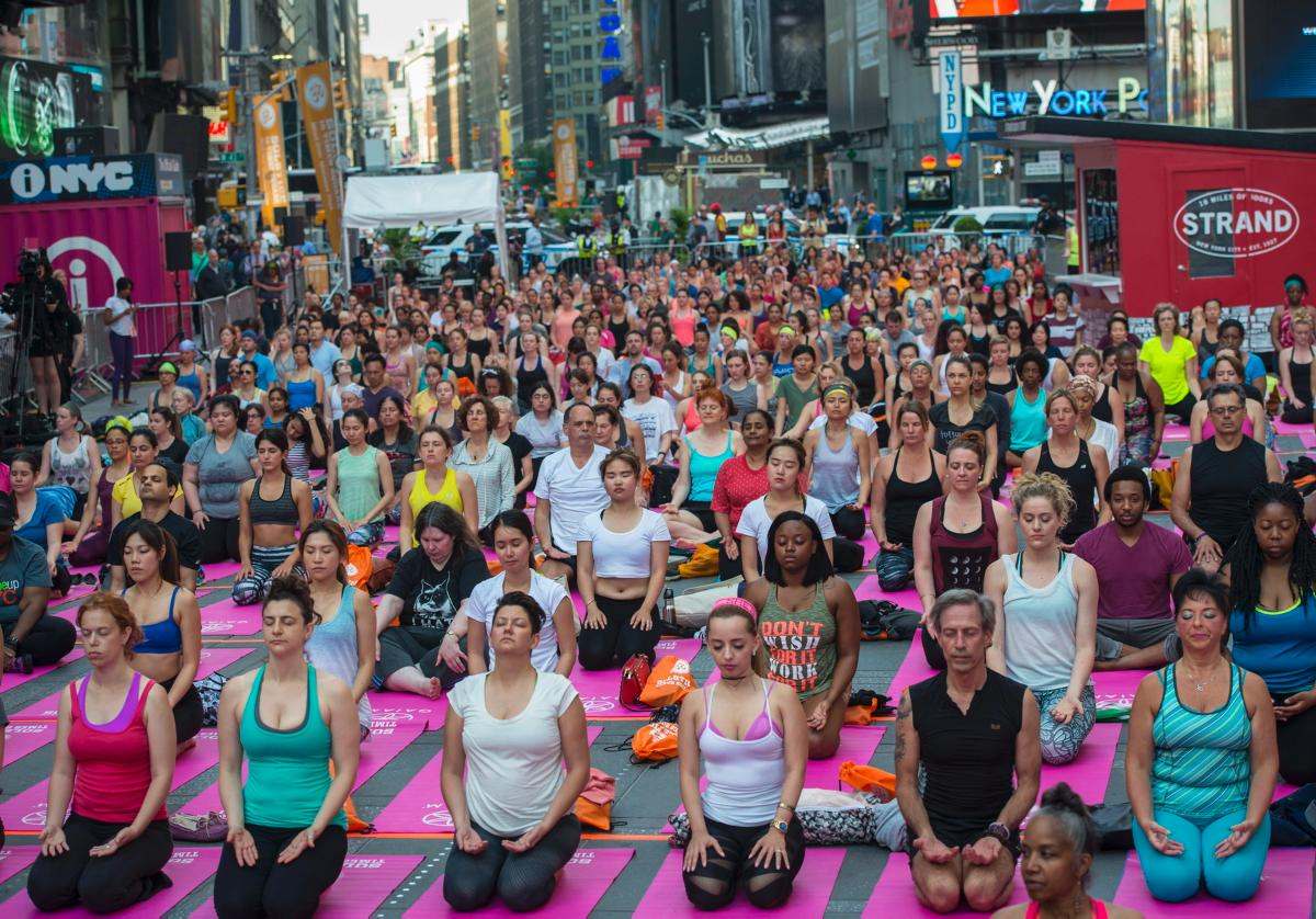 Times Meydanı’nda toplanan binlerce New Yorklu, eğitmenler eşliğinde yoga yaptı.