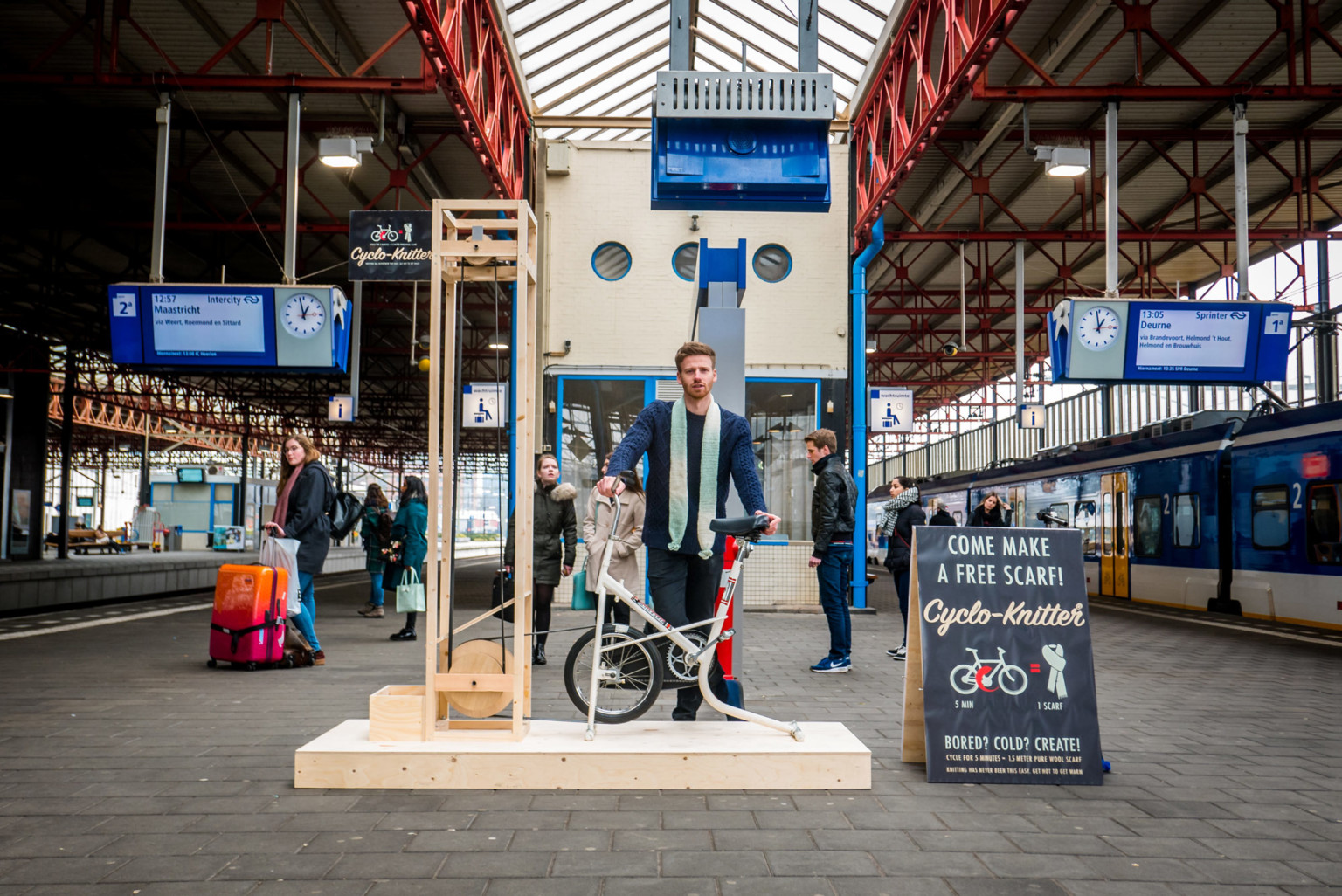 The Cyclo Knitter, tasarım öğrencisi George Barratt-Jones tarafından üretilen bisiklet tabanlı bir makine. Mekanizma, ahşap ve bisiklet parçalarının basit bir kombinasyonundan yapılıyor ve kullanan kişi hafif egzersiz ile örneğin, bir fular örebiliyor. Barratt-Jones, Eindhoven’da bir gün tren beklerken bu fikri aklına geldi. Onun bu buluşu, diğer yolcuların platformda zaman geçirirken ısınmasına ve bunu yaparken de bir kış aksesuarı ile edinmesine olanak tanıyor.