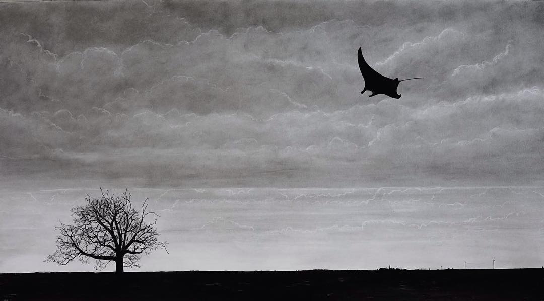 Trevor Guthrie, natürmort, manzara, portre ve figüratif sanat gibi bildik türlerin geniş formatlı karakalem resimlerini yapıyor. Guthrie’nin resimlerinde, gizemli anlatılar ya da yaratıkların olduğu sahneler, yatak odası ya da ofisler gibi olmamaları gereken yerlerde uçuyor.
