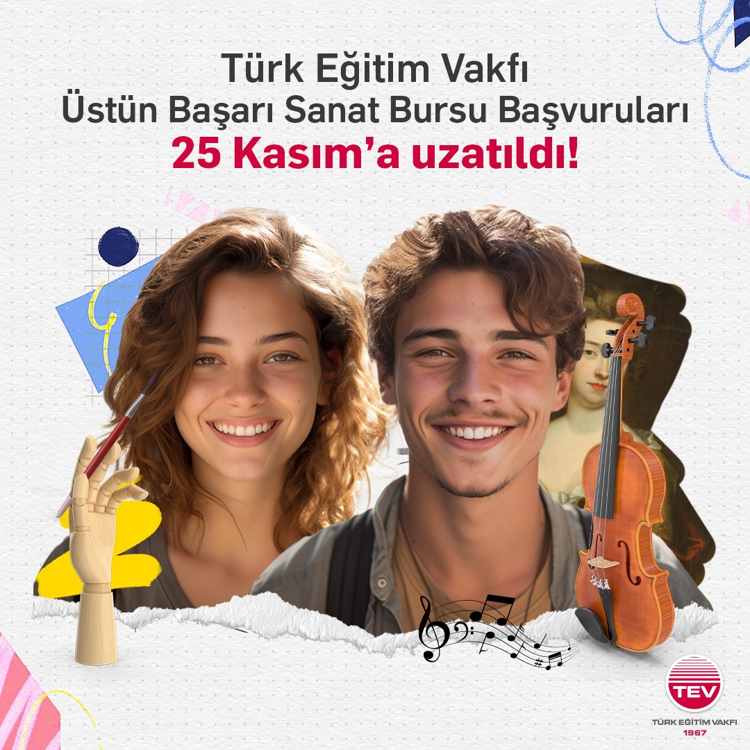 tev.org.tr adresinden çevrimiçi olarak başvurulabilen TEV’in üstün başarı sanat bursu için son başvuru tarihi 25 Kasım Cumartesi akşamı saat 23.59’a kadar uzatıldı.