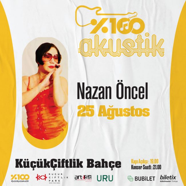 Türk pop müziğinin en önemli isimlerinden Nazan Öncel, 25 Ağustos’ta vereceği konserde Sokak Kızı, Gidelim Buralardan, Erkekler de Yanar, Geceler Kara Tren gibi 90’lardan bugüne en güzel şarkılarının akustik versiyonlarını seslendirecek. Yemyeşil huzurlu bahçe ortamıyla şehrin merkezinde ama karmaşasından uzak bir kaçış noktası sunan KüçükÇiftlik Bahçe’de, URU ve Art-İst Organizasyon tarafından düzenlenen %100 Akustik konserlerinin biletleri Biletix’te, Bubilet’te ve KüçükÇiftlik Park gişesinde!