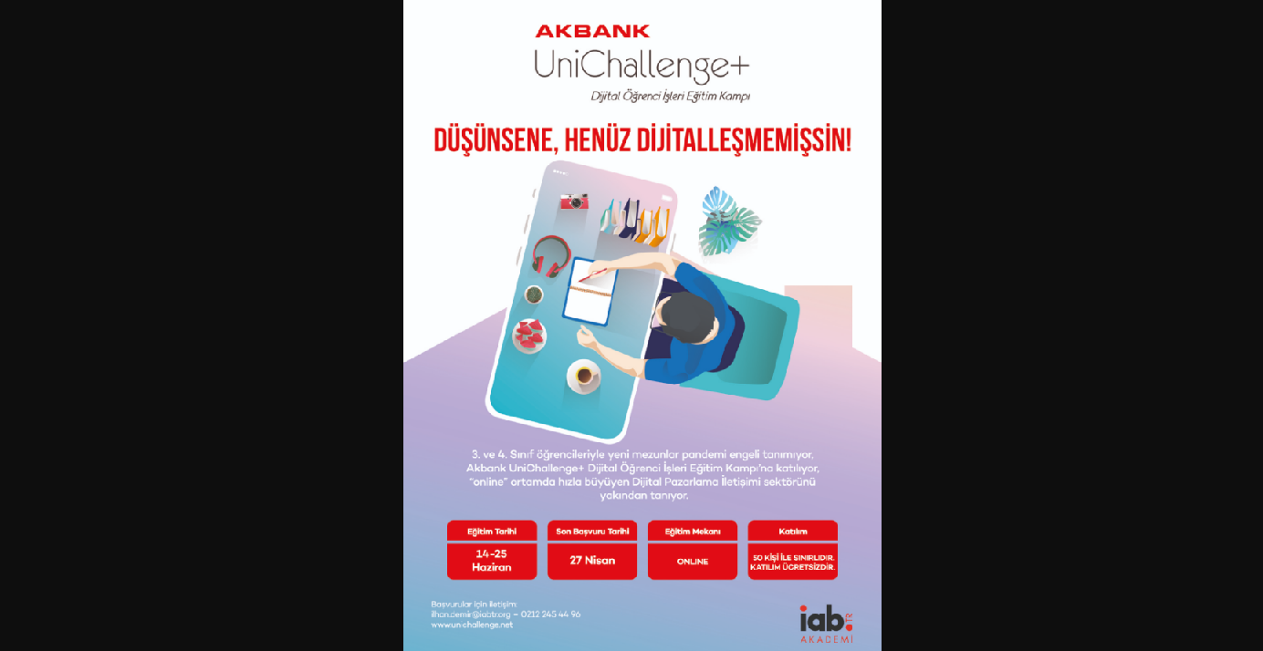 IAB tarafından Boğaziçi Üniversitesi İktisadi ve İdari Bilimler Fakültesi’nin desteğiyle ilk kez 2015 yılında düzenlenen ve son 4 yıldır Akbank’ın ana sponsorluğunda gerçekleşen Akbank UniChallenge+Dijital Öğrenci İşleri Eğitim Kampı, geçen yıl olduğu gibi bu yıl da pandemi nedeniyle online olarak yapılacak.