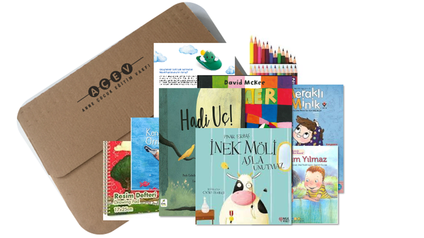 Çocuklara gönderilmek üzere hazırlanan sette AÇEV’in erken çocukluk uzmanları tarafından seçilen 5 resimli hikaye kitabı, kitap etkinlik yönergeleri, 1 çocuk dergisi, 1 resim defteri ve kuru boya seti yer alıyor. Kitaplar, Kidega kitap satış platformu üzerinden satın alınarak 120 TL’lik setler oluşturuluyor. 3747’ye SMS göndererek ya da FonZip üzerinden istenilen miktarda bağış yaparak, daha çok çocuğun projeden faydalanmasına destek olunabiliyor.