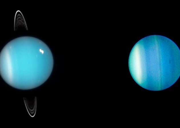 görsel: Bir yıl arayla çekilen iki Hubble teleskopu Uranüs görüntüsü Uranüs’ün sürekli olarak yüzünü yeniden oluşturduğunu gösteriyor. 2005 ve 2006’da çekilen görüntüler halkaların görüş alanından kaybolduğunu ve karanlık bir fırtına da dahil olmak üzere yeni bulut desenlerinin ortaya çıktığını gösteriyor. NASA, ESA, Mark Showalter (SETI Enstitüsü), Lawrence A. Sromovsky (UW-Madison), Patrick M. Fry (UW-Madison), Heidi Hammel (SSI), Kathy Rages (SETI Enstitüsü)