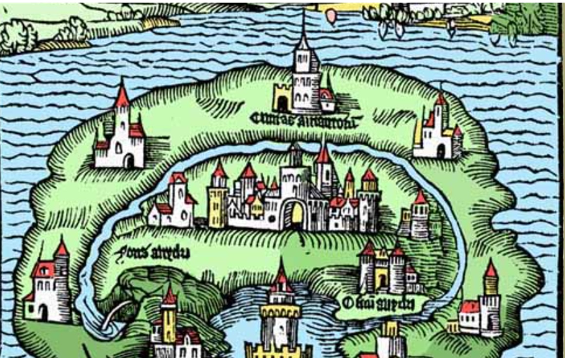 Aşağıdaki resim, milattan önceden 20. yüzyıla kadar uzanan Latince metinlerin ilginç bir deposu olan Bibliotheca Augustana’da çevrimiçi olarak yayınlanan kitabın ilk baskılarından birinden alınmış. Ne yazık ki, güzel renklere rağmen gotik harfler bu haritadaki metin etiketlerini okunamaz hale getiriyor.