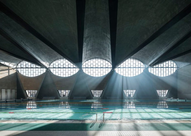 Fotoğraf, havuzun tavanına yükselen beton kemerlerin yanı sıra eliptik pencereler sayesinde yaratılan çarpıcı bir gölge oyununu gözler önüne seriyor.